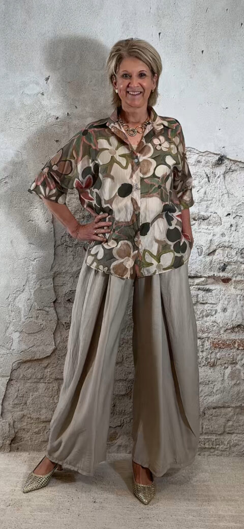 Luchtige zijde-look blouse met bloemenprint in khaki tinten.
